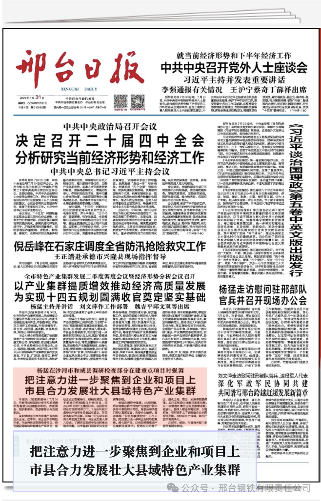 楊猛在調(diào)研中強(qiáng)調(diào),沙河玻璃、邢臺(tái)特鋼在我市傳統(tǒng)產(chǎn)業(yè)轉(zhuǎn)型升級(jí)中具有代表性和示范性,各級(jí)各相關(guān)部門要認(rèn)真落實(shí)省、市委全會(huì)精神,緊緊圍繞“投資消費(fèi)質(zhì)效年”工作主線,把注意力進(jìn)一步向企業(yè)和項(xiàng)目聚焦,潛心抓產(chǎn)業(yè),以有效投資推動(dòng)產(chǎn)業(yè)集群發(fā)展壯大。要常態(tài)化問(wèn)需于企,強(qiáng)化土地、資金、政策等要素保障,實(shí)打?qū)崕椭髽I(yè)解決困難問(wèn)題,以一流營(yíng)商環(huán)境為企業(yè)發(fā)展增動(dòng)能、強(qiáng)信心。要深入推進(jìn)邢商回邢、以商招商,吸引更多上下游配套企業(yè)來(lái)邢投資發(fā)展,加快延長(zhǎng)產(chǎn)業(yè)鏈,提升產(chǎn)品市場(chǎng)競(jìng)爭(zhēng)力。